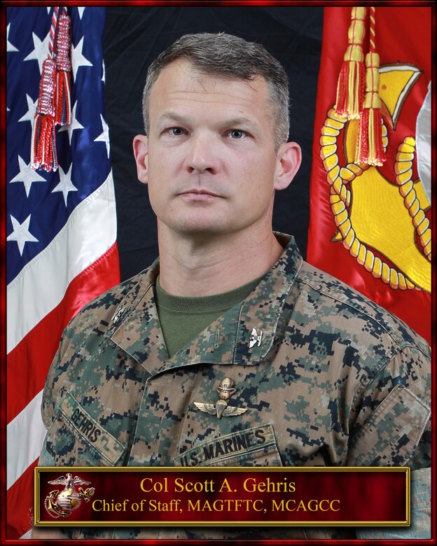 Col Gehris served as the Director of Tactical Training Exercise Control Group from May 2022 through July 2023 and was selected to be the Chief of Staff, Marine Air Ground Task Force Training Command, Marine Corps Air Ground Combat Center, Twentynine Palms in July 2023.