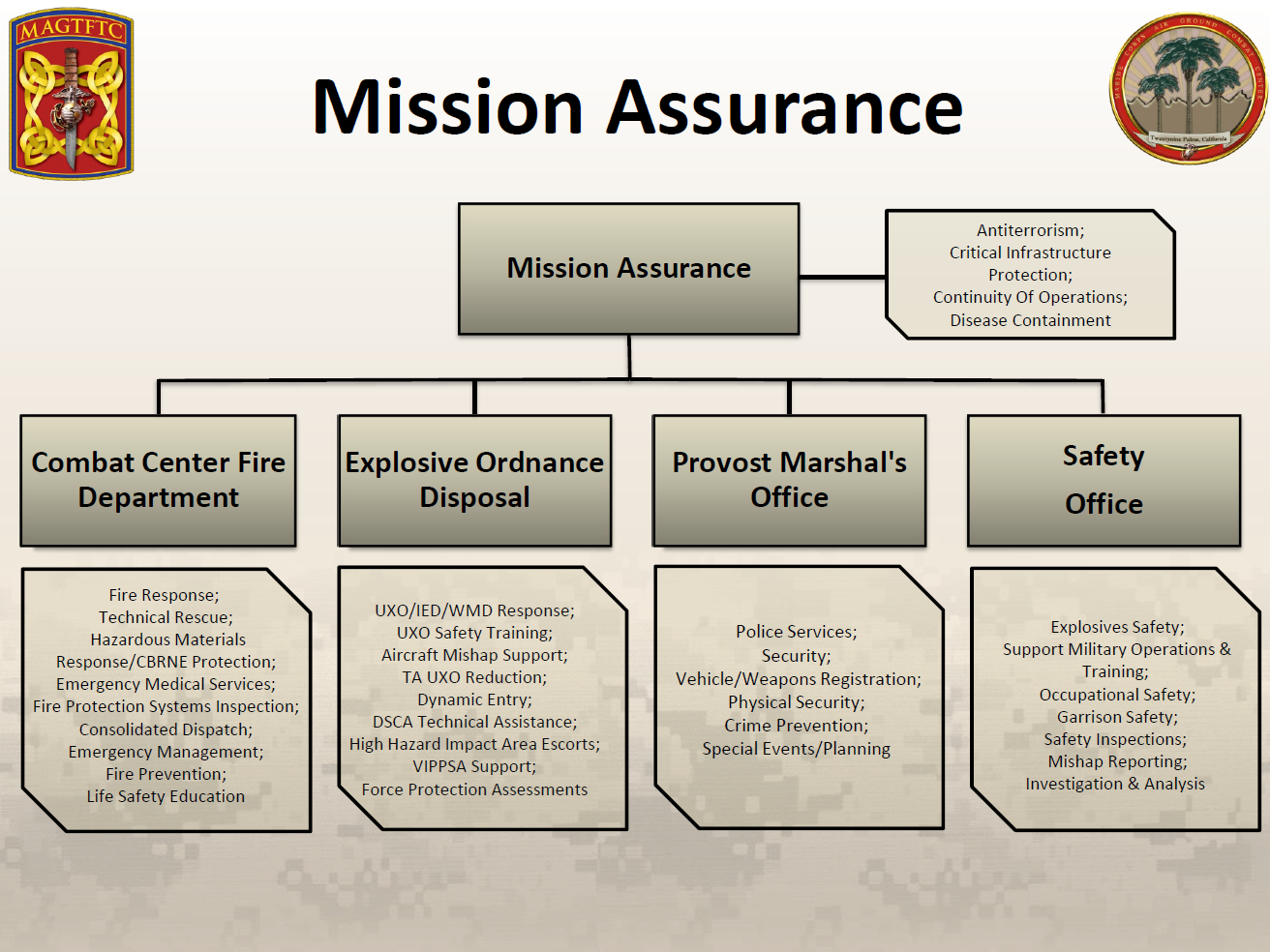 The Mission Assurance Division provides programs for the protection of life and property, and restorations of resources affecting the Combat Center Mission. We provide emergency services, and active security posture and mission assurance programs designed to deter, detect, delay defend, and mitigate natural or man-made crisis events.